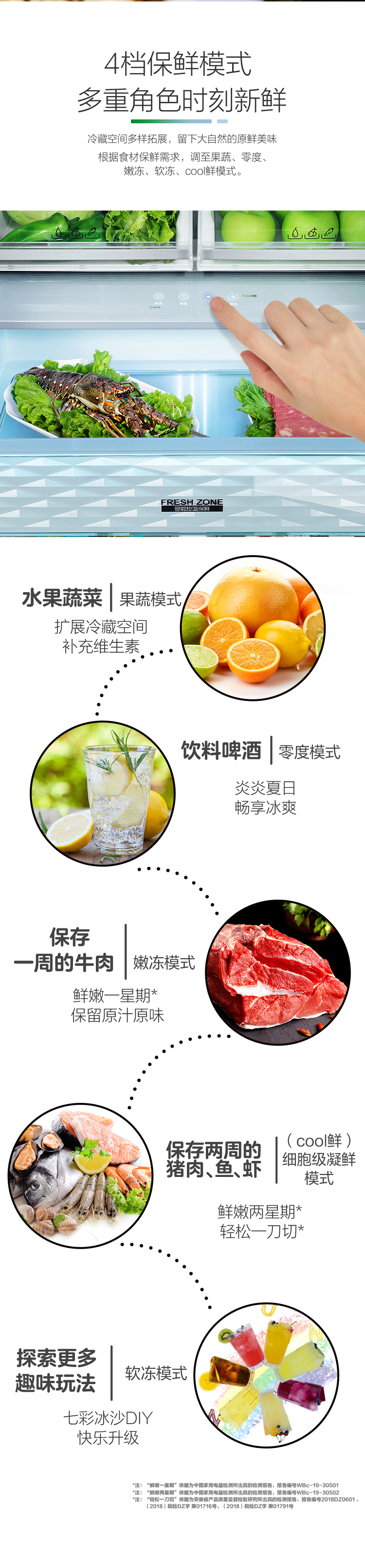 搭載-5℃嫩凍凝鮮科技,鮮嫩兩星期,輕松一刀切。Plasma等離子除菌凈味,除菌保鮮,長(zhǎng)久新鮮。4檔保鮮模式,多重角色時(shí)刻新鮮。