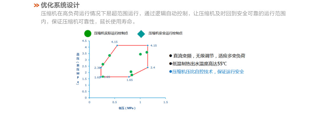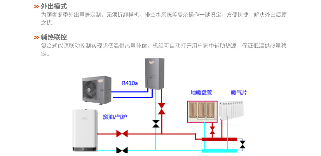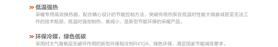采用直流變頻技術,制熱量范圍8.5~16kW,穩定運行環境溫度范圍-20℃~28℃、出水溫度范圍25~55℃,具有低溫強熱、節能高效、穩定可靠等特點,適用于集中供暖覆蓋不足的農村及城郊地區以及城市獨立供暖的公寓、復式樓、別墅、單元寫字樓、餐廳、商店、娛樂場所等空間.